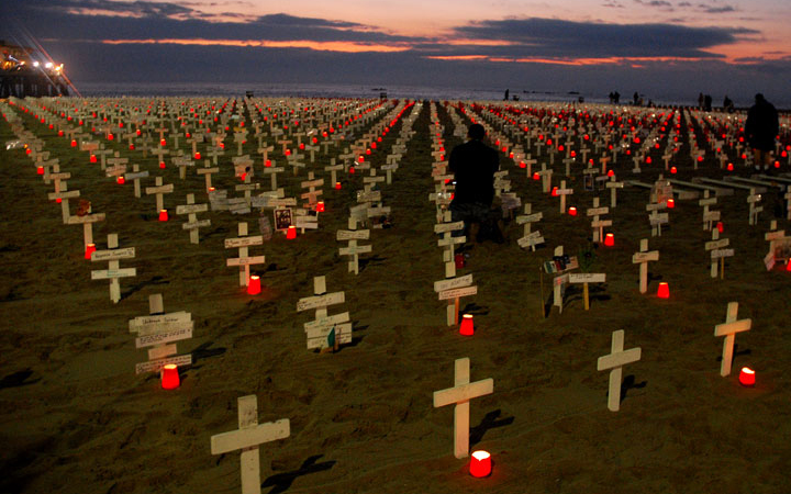 | Visitors to Arlington west in Santa Monica California look down at crosses