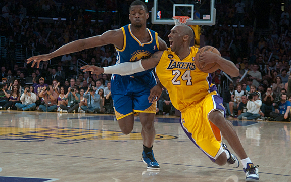 | Left Power and Small forward Harrison Barnes from the Golden State Warriors guards Kobe Bryant of the Los Angeles Lakers as Bryant grimaces in pain as Bryant just ruptured his achilles tendon inside the Staples Center which is the home for the Los Angeles Lakers and is located in Downtown Los Angeles on Friday April 12 2013 as the Lakes hosted the Warriors in a NBA Pacific division basketball game in which Los Angeles won 118-116 |