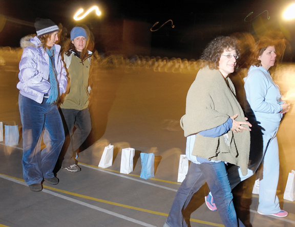 | Clockwise Francine Lis, Amy Madnick, Laine Sugarman, and Michelle Plotkin walk their portion of the relay for each of their individual team. Despite the fact that it was very early in the morning, wet, and very cold, these four women completed their turn out on the track. . |