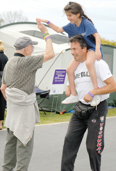 Seven-year-old Nicole Elias receives a high five by Charles Brucker as she is carried around the track on the shoulders of Humby Baxter